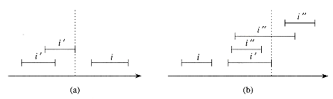 Figure 15.5 Intervals in the proof of Theorem 15.2. The value of max[left[x]] is shown in each case as a dashed line. (a) Case 2: the search goes right. No interval i' can overlap i. (b) Case 1: the search goes left. The left subtree of x contains an interval that overlaps i (situation not shown), or there is an interval i' in x's left subtree such that high[i'] = max[left[x]]. Since i does not overlap i', neither does it overlap any interval i\" in x' s right subtree, since low[i']