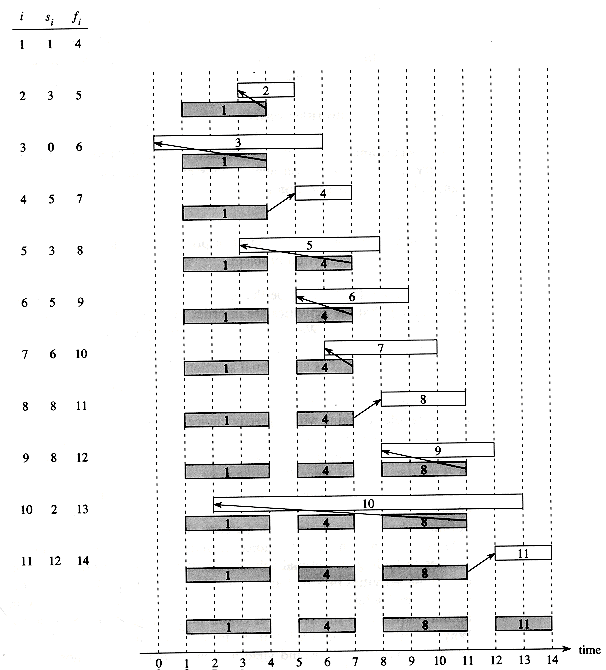 The operation of the algorithm is shown in Figure 17.1. The set A collects the selected activities. The variable j specifies the most recent addition to A. Since the activities are considered in order of nondecreasing finishing time, fj is always the maximum finishing time of any activity in A. That is,