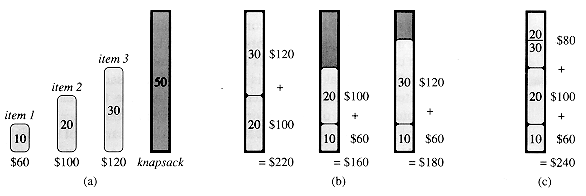 To see that this greedy strategy does not work for the 0-1 knapsack problem, consider the problem instance illustrated in Figure 17.2(a). There are 3 items, and the knapsack can hold 50 pounds. Item 1 weighs 10 pounds and is worth 60 dollars. Item 2 weighs 20 pounds and is worth 100 dollars. Item 3 weighs 30 pounds and is worth 120 dollars. Thus, the value per pound of item 1 is 6 dollars per pound, which is greater than the value per pound of either item 2 (5 dollars per pound) or item 3 (4 dollars per pound). The greedy strategy, therefore, would take item 1 first. As can be seen from the case analysis in Figure 17.2(b), however, the optimal solution takes items 2 and 3, leaving 1 behind. The two possible solutions that involve item 1 are both suboptimal.