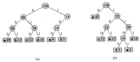 The decoding process needs a convenient representation for the prefix code so that the initial codeword can be easily picked off. A binary tree whose leaves are the given characters provides one such representation. We interpret the binary codeword for a character as the path from the root to that character, where 0 means "go to the left child" and 1 means "go to the right child." Figure 17.4 shows the trees for the two codes of our example. Note that these are not binary search trees, since the leaves need not appear in sorted order and internal nodes do not contain character keys.