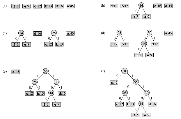 For our example, Huffman's algorithm proceeds as shown in Figure 17.5. Since there are 6 letters in the alphabet, the initial queue size is n = 6, and 5 merge steps are required to build the tree. The final tree represents the optimal prefix code. The codeword for a letter is the sequence of edge labels on the path from the root to the letter.