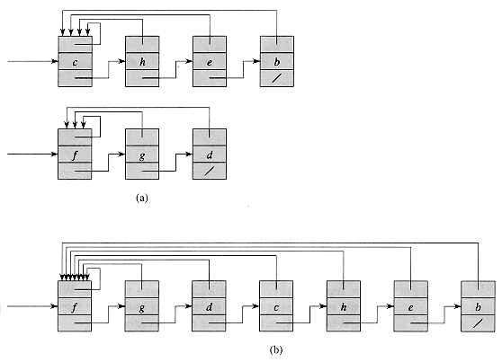 A simple way to implement a disjoint-set data structure is to represent each set by a linked list. The first object in each linked list serves as its set's representative. Each object in the linked list contains a set member, a pointer to the object containing the next set member, and a pointer back to the representative. Figure 22.2(a) shows two sets. Within each linked list, the objects may appear in any order (subject to our assumption that the first object in each list is the representative).