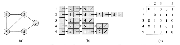 There are two standard ways to represent a graph G = (V, E): as a collection of adjacency lists or as an adjacency matrix. The adjacency-list representation is usually preferred, because it provides a compact way to represent sparse graphs--those for which |E| is much less than |V|2. Most of the graph algorithms presented in this book assume that an input graph is represented in adjacency-list form. An adjacency-matrix representation may be preferred, however, when the graph is dense--|E| is close to |V|2 -- or when we need to be able to tell quickly if there is an edge connecting two given vertices. For example, two of the all-pairs shortest-paths algorithms presented in Chapter 26 assume that their input graphs are represented by adjacency matrices.