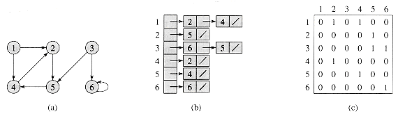 Figures 23.1(c) and 23.2(c) are the adjacency matrices of the undirected and directed graphs in Figures 23.1(a) and 23.2(a), respectively. The adjacency matrix of a graph requires