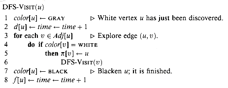 As in breadth-first search, whenever a vertex v is discovered during a scan of the adjacency list of an already discovered vertex u, depth-first search records this event by setting v's predecessor field