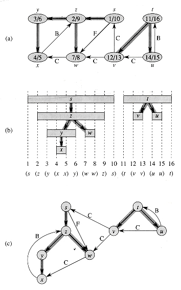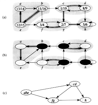 Figure 23.9 (a) A directed graph G. The strongly connected components of G are shown as shaded regions. Each vertex is labeled with its discovery and finishing times. Tree edges are shaded. (b) The graph GT, the transpose of G. The depth-first tree computed in line 3 of STRONGLY-CONNECTED-COMPONENTS is shown, with tree edges shaded. Each strongly connected component corresponds to one depth-first tree. Vertices b, c, g, and h, which are heavily shaded, are forefathers of every vertex in their strongly connected component; these vertices are also the roots of the depth-first trees produced by the depth-first search of GT. (c) The acyclic component graph Gscc obtained by shrinking each strongly connected component of G to a single vertex.