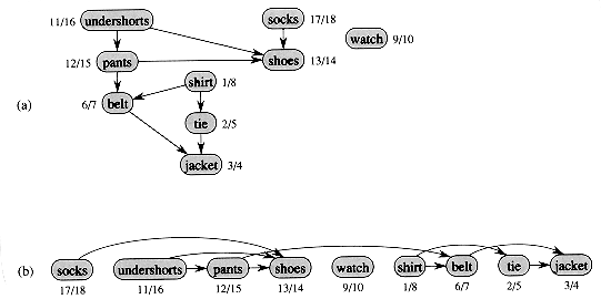 Section 23.1 discusses the two most common computational representations of graphs: as adjacency lists and as adjacency matrices. Section 23.2 presents a simple graph-searching algorithm called breadth-first search and shows how to create a breadth-first tree. Section 23.3 presents depth-first search and proves some standard results about the order in which depth-first search visits vertices. Section 23.4 provides our first real application of depth-first search: topologically sorting a directed acyclic graph. A second application of depth-first search, finding the strongly connected components of a directed graph, is given in Section 23.5.
