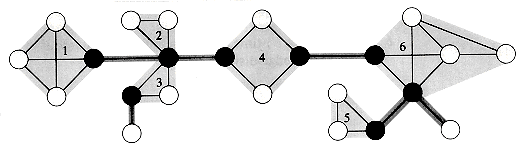 Figure 23.10 The articulation points, bridges, and biconnected components of a connected, undirected graph for use in Problem 23-2. The articulation points are the heavily shaded vertices, the bridges are the heavily shaded edges, and the biconnected components are the edges in the shaded regions, with a bcc numbering shown.