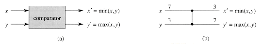 Sorting networks are comparison networks that always sort their inputs, so it makes sense to begin our discussion with comparison networks and their characteristics. A comparison network is comprised solely of wires and comparators. A comparator, shown in Figure 28.1 (a), is a device with two inputs, x and y, and two outputs, x' and y', that performs the following function: