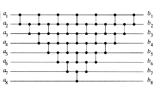 has n levels of comparators. Figure 28.13 shows an odd-even transposition network on 8 inputs. As can be seen in the figure, for i = 2, 3, . . . , n - 1 and d = 1, 2, . . . , n, line i is connected by a depth-d comparator to line j = i + (-1)i+d if 1