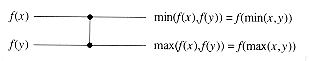 To prove the claim, consider a comparator whose input values are x and y. The upper output of the comparator is min(x,y) and the lower output is max(x,y). Suppose we now apply f(x) and f(y) to the inputs of the comparator, as is shown in Figure 28.4. The operation of the comparator yields the value min(f(x), f(y)) on the upper output and the value max(f(x), f(y)) on the lower output. Since f is monotonically increasing, x