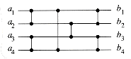 Figure 28.2 shows a comparison network, which is a set of comparators interconnected by wires. We draw a comparison network on n inputs as a collection of n horizontal lines with comparators stretched vertically. Note that a line does not represent a single wire, but rather a sequence of distinct wires connecting various comparators. The top line in Figure 28.2, for example, represents three wires: input wire a1, which connects to an input of comparator A; a wire connecting the top output of comparator A to an input of comparator C; and output wire b1, which comes from the top output of comparator C. Each comparator input is connected to a wire that is either one of the network's n input wires a1, a2, . . . , an or is connected to the output of another comparator. Similarly, each comparator output is connected to a wire that is either one of the network's n output wires b1, b2, . . . , bn or is connected to the input of another comparator. The main requirement for interconnecting comparators is that the graph of interconnections must be acyclic: if we trace a path from the output of a given comparator to the input of another to output to input, etc., the path we trace must never cycle back on itself and go through the same comparator twice. Thus, as in Figure 28.2, we can draw a comparison network with network inputs on the left and network outputs on the right; data move through the network from left to right.