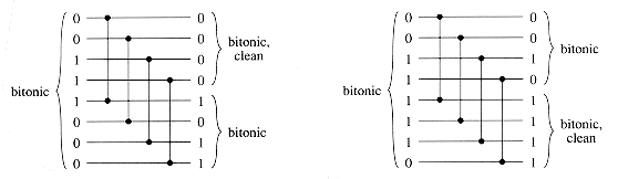 When a bitonic sequence of 0's and 1's is applied as input to a half-cleaner, the half-cleaner produces an output sequence in which smaller values are in the top half, larger values are in the bottom half, and both halves are bitonic. In fact, at least one of the halves is clean--consisting of either all 0's or all 1's--and it is from this property that we derive the name "half-cleaner." (Note that all clean sequences are bitonic.) The next lemma proves these properties of half-cleaners.