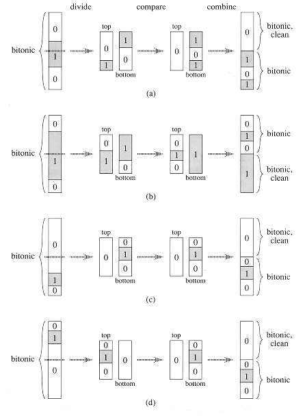 Figure 28.8 The possible comparisons in HALF-CLEANER[n]. The input sequence is assumed to be a bitonic sequence of 0's and 1's, and without loss of generality, we assume that it is of the form 00 . . . 011 . . . 100 . . . 0. Subsequences of 0's are white, and subsequences of 1's are gray. We can think of the n inputs as being divided into two halves such that for i = 1, 2, . . . , n/2, inputs i and i + n/2 are compared. (a)-(b) Cases in which the division occurs in the middle subsequence of 1's. (c)-(d) Cases in which the division occurs in a subsequence of 0's. For all cases, every element in the top half is at least as small as every element in the bottom half, both halves are bitonic, and at least one half is clean.