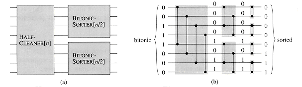 . (b) The equivalent operation for HALF-CLEANER[n]. The bitonic input sequence