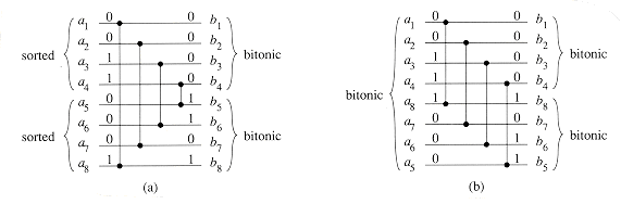 The bitonic sorter that we shall construct is a comparison network that sorts bitonic sequences of 0's and 1's. Exercise 28.3-6 asks you to show that the bitonic sorter can sort bitonic sequences of arbitrary numbers.