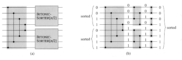 Thus, a zero-one bitonic sequence can be sorted by BITONIC-SORTER, which has a depth of lg n. It follows by the analog of the zero-one principle given as Exercise 28.3-6 that any bitonic sequence of arbitrary numbers can be sorted by this network.