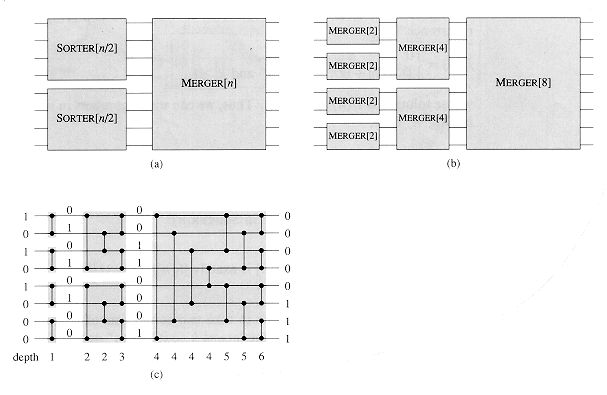 Figure 28.12 The sorting network SORTER[n] constructed by recursively combining merging networks. (a) The recursive construction. (b) Unrolling the recursion. (c) Replacing the MERGER boxes with the actual merging networks. The depth of each comparator is indicated, and sample zero-one values are shown on the wires.