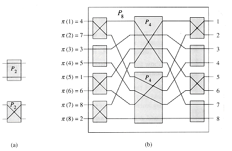 Figure 28.14 Permutation networks. (a) The permutation network P2, which consists of a single switch that can be set in either of the two ways shown. (b) The recursive construction of P8 from 8 switches and two P4's. The switches and P4's are set to realize the permutation