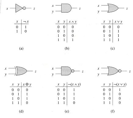 The operation of each gate, and of any boolean combinational element, can be described by a truth table, shown under each gate in Figure 29.1. A truth table gives the outputs of the combinational element for each possible setting of the inputs. For example, the truth table for the XOR gate tells us that when the inputs are x = 0 and y = 1, the output value is z = 1; it computes the "exclusive OR" of its two inputs. We use the symbols