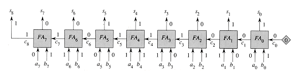 An n-bit ripple-carry adder is formed by cascading n full adders FA0, FA1, . . . , FAn-1, feeding the carry-out ci+1 of FAi directly into the carry-in input of FAi+1. Figure 29.4 shows an 8-bit ripple-carry adder. The carry bits "ripple" from right to left. The carry-in c0 to full adder FA1 is hardwired to 0, that is, it is 0 no matter what values the other inputs take on. The output is the (n+1)-bit number s =