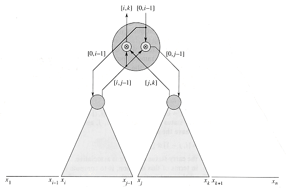 Some time after this upward phase of computation, the node receives from its parent the product [0, i - 1] of all inputs that come before the leftmost input xi that it spans. The node now likewise computes values for its children. The leftmost input spanned by the node's left child is also xi, and so it passes the value [0, i - 1] to the left child unchanged. The leftmost input spanned by its right child is xj, and so it must produce [0, j - 1]. Since the node receives the value [0, i - 1] from its parent and the value [i, j - 1] from its left child, it simply computes [0, j - 1]