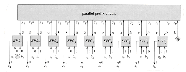 Now that we have a parallel prefix circuit, we can complete the description of the carry-lookahead adder. Figure 29.10 shows the construction. An n-bit carry-lookahead adder consists of n + 1 KPG boxes, each of