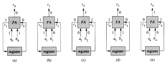 Figure 29.17 The operation of a bit-serial adder. During the ith clock period, for i = 0, 1, . . . , n, the full adder FA takes input bits ai and bi from the outside world and a carry bit ci from the register. The full adder then outputs sum bit si, which is provided externally, and carry bit ci+1, which is stored back in the register to be used during the next clock period. The register is initialized with c0 = 0. (a)-(e) The state of the circuit in each of the five clock periods during the addition of a =