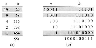 Figure 29.18 Multiplying 19 by 29 with the Russian peasant's algorithm. The a- column entry in each row is half of the previous row's entry with fractions ignored, and the b-column entries double from row to row. We add the b-column entries in all rows with odd a-column entries, which are shaded. This sum is the desired product. (a) The numbers expressed in decimal. (b) The same numbers in binary.