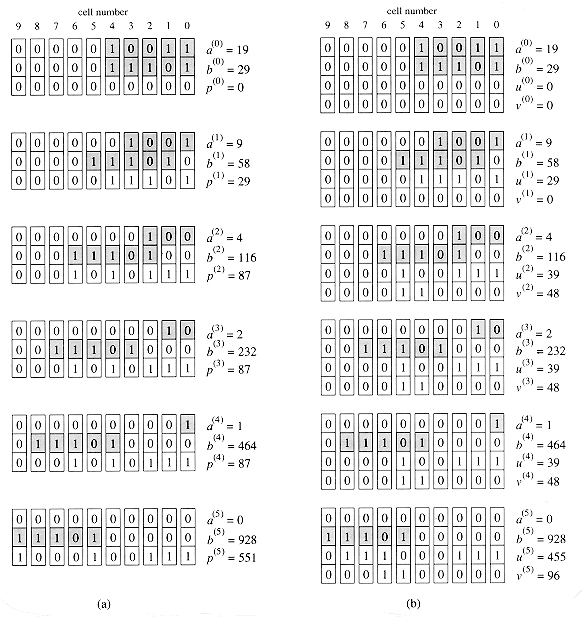 , with n = 5. The situation at the beginning of each step j is shown, with the remaining significant bits of a(j) and b(j) shaded. (a) A slow implementation that runs in