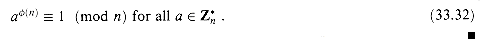 Section 33.1 introduces basic concepts of number theory, such as divisibility, modular equivalence, and unique factorization. Section 33.2 studies one of the world's oldest algorithms: Euclid's algorithm for computing the greatest common divisor of two integers. Section 33.3 reviews concepts of modular arithmetic. Section 33.4 then studies the set of multiples of a given number a, modulo n, and shows how to find all solutions to the equation ax b (mod n) by using Euclid's algorithm. The Chinese remainder theorem is presented in Section 33.5. Section 33.6 considers powers of a given number a, modulo n, and presents a repeated-squaring algorithm for efficiently computing ab mod n, given a, b, and n. This operation is at the heart of efficient primality testing. Section 33.7 then describes the RSA public-key cryptosystem. Section 33.8 describes a randomized primality test that can be used to find large primes efficiently, an essential task in creating keys for the RSA cryptosystem. Finally, Section 33.9 reviews a simple but effective heuristic for factoring small integers. It is a curious fact that factoring is one problem people may wish to be intractable, since the security of RSA depends on the difficulty of factoring large integers.