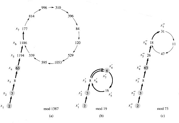 of the binary representation of b. As an example, for a = 7, b = 560, and n = 561, the algorithm computes the sequence of values modulo 561 shown in Figure 33.4; the sequence of exponents used is shown in row c of the table.