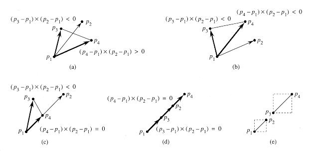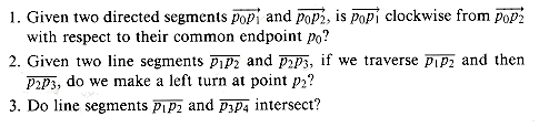 We can answer each question in O(1) time, which should come as no surprise since the input size of each question is O(1). Moreover, our methods will use only additions, subtractions, multiplications, and comparisons. We need neither division nor trigonometric functions, both of which can be computationally expensive and prone to problems with round-off error. For example, the "straightforward" method of determining whether two segments intersect--compute the line equation of the form y = mx + b for each segment (m is the slope and b is the y-intercept), find the point of intersection of the lines, and check whether this point is on both segments--uses division to find the point of intersection. When the segments are nearly parallel, this method is very sensitive to the precision of the division operation on real computers. The method in this section, which avoids division, is much more accurate.