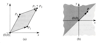 Computing cross products is at the heart of our line-segment methods. Consider vectors p1 and p2, shown in Figure 35.1(a). The cross product p1 x p2 can be interpreted as the signed area of the parallelogram formed by the points (0, 0), p1, p2, and p1 + p2 = (x1 + x2, y1 + y2). An equivalent, but more useful, definition gives the cross product as the determinant of