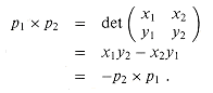 1 Actually, the cross product is a three-dimensional concept. It is a vector that is perpendicular to both p1 and p2 according to the "right-hand rule" and whose magnitude is |x1y2 - x2y1|. In this chapter, however, it will prove convenient to treat the cross product simply as the value x1y2 - x2y1.
