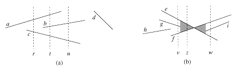 What happens when the sweep line passes through the intersection of two segments? As Figure 35.4(b) shows, their positions in the total order are reversed. Sweep lines v and w are to the left and right, respectively, of the point of intersection of segments e and f, and we have e >v f and f >w e. Note that because we assume that no three segments intersect at the same point, there must be some vertical sweep line x for which intersecting segments e and f are consecutive in the total order >x. Any sweep line that passes through the shaded region of Figure 35.4(b), such as z, has e and f consecutive in its total order.