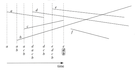 For any given x, the relation ">x" is a total order (see Section 5.2) on segments that intersect the sweep line at X. The order may differ for differing values of x, however, as segments enter and leave the ordering. A segment enters the ordering when its left endpoint is encountered by the sweep, and it leaves the ordering when its right endpoint is encountered.