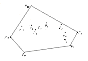 The convex hull of a set Q of points is the smallest convex polygon P for which each point in Q is either on the boundary of P or in its interior. We denote the convex hull of Q by CH(Q). Intuitively, we can think of each point in Q as being a nail sticking out from a board. The convex hull is then the shape formed by a tight rubber band that surrounds all the nails. Figure 35.6 shows a set of points and its convex hull.