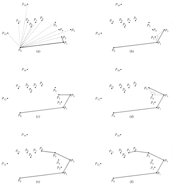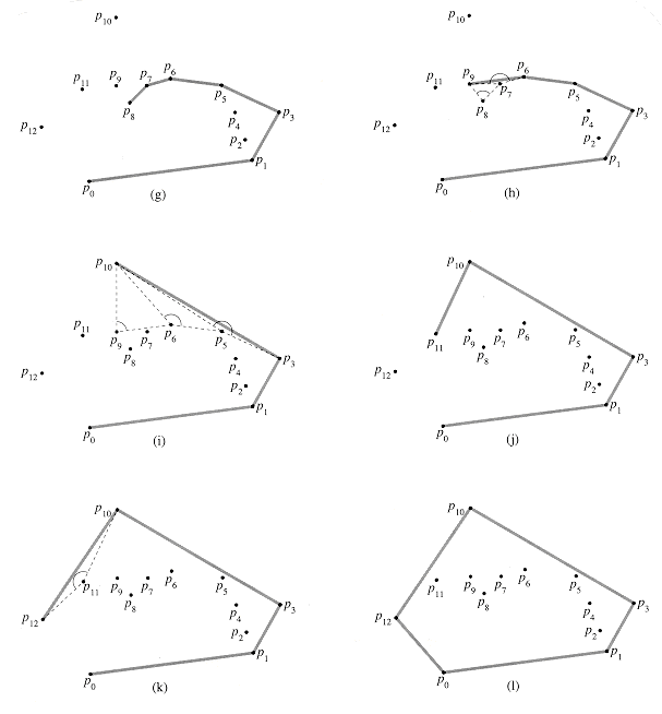 The remainder of the procedure uses the stack S Lines 3-6 initialize the stack to contain, from bottom to top, the first three points p0, p1, and p2. Figure 35.7(a) shows the initial stack S. The for loop of lines 7-10 iterates once for each point in the subsequent