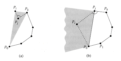 Now consider a point pi that is pushed onto S. Referring back to Figure 35.8(b), let pj be the vertex on the top of S just prior to pushing pi, and let pk be the predecessor of pj on S. We claim that pi must fall within the shaded region of Figure 35.8(b), which corresponds directly to the shaded regions of Figure 35.9. Because the angle