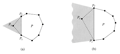 Before we consider the case in which a point is pushed onto the stack, let us examine another geometrical property, illustrated in Figures 35.9(a) and (b). Let P be a convex polygon, and choose any side