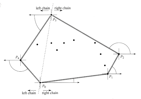 of the vertices of CH(Q). We start with p0. As Figure 35.10 shows, the next convex hull vertex p1 has the least polar angle with respect to p0. (In case of ties, we choose the point farthest from p0.) Similarly, p2 has the least polar angle with respect to pl, and so on. When we reach the highest vertex, say pk (breaking ties by choosing the farthest such vertex), we have constructed, as Figure 35.10 shows, the right chain of CH(Q). To construct the left chain, we start at pk and choose pk+l as the point with the least polar angle with respect to pk, but from the negative x-axis. We continue on, forming the left chain by taking polar angles from the negative x-axis, until we come back to our original vertex p0.