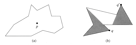 Figure 35.11 The definition of a star-shaped polygon, for use in Exercise 35.3-4. (a) A star-shaped polygon. The segment from point p to any point q on the boundary intersects the boundary only at q. (b) A non-star-shaped polygon. The shaded region on the left is the shadow of q, and the shaded region on the right is the shadow of q'. Since these regions are disjoint, the kernel is empty.