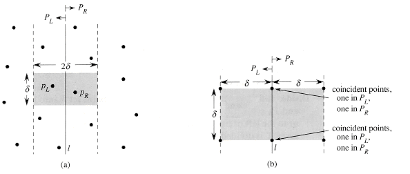 found by oneof the recursive calls, or it is a pair of points with one point in PL and the other in PR. The algorithm determines if there is such a pair whose distance is less than