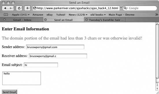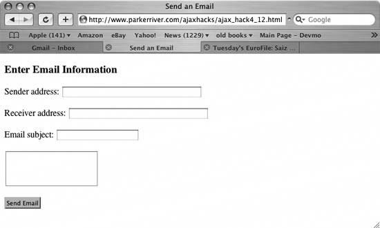 Allow the user to enter the email properties in text fields and then send an email without a page round trip. This hack not only sends an email without a page round trip, but also validates the syntax of the entered email addresses and provides useful messages in the event of invalid entries. Figure 4-20 shows what the hack's web page looks like in the Safari browser. Figure 4-20. An email application without round trips