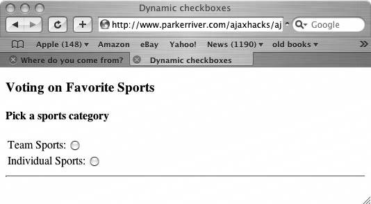 Let a web page's checkbox content evolve from a user's interaction with an application. Most web forms are static, meaning the text labels and entry widgets (e.g., textareas, checkboxes, and radio buttons) are hardcoded into the HTML. Lots of applications, however, can benefit from the ability to whip together form elements on the fly, based on the user-interface widgets the user is clicking. The content for the forms, if necessary, can even be derived from a server, such as questions for various types of quizzes and polls. "Dynamically Generate a New Selection List Using Server Data" [Hack #15] showed how to do this with a select list widget, so why don't we auto-generate a bunch of checkboxes? This hack gives users a choice of "Team Sports" or "Individual Sports" in two radio buttons and then, when they click either button, grabs the sports categories from a server component and creates a new group of checkboxes. Choose Your ActivityFigure 2-12 shows our barebones web page to begin with, before the DOM magic starts. Figure 2-12. Let the web form evolve