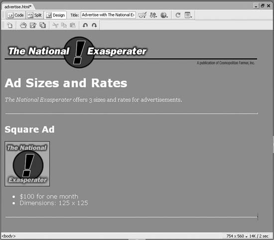 A full banner ad for the National Exasperater appears. Add the Alt text next. With the image still selected, in the Alt box in the Property inspector, type Full Banner Ad Sample.