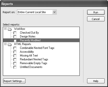 aren't actually part of the current site. Select the types of reports you want Dreamweaver to generate.