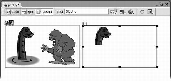 There's one additional wrinkle to absolute positioning. For nested layers (Section 8.8), the position values are calculated based on the position of the parent layer. For example, if you have one layer that's located 300 pixels from the top of the page, an absolutely positioned layer nested inside that layer with a Top position setting of 20 won't appear 20 pixels from the top of the page. Instead, it appears 20 pixels from the top of the parent layer, or, in this example, 320 pixels from the top of the page. 8.3.1.7 ClipThe Clip property can hide all but a rectangular piece of a layer, as shown in Figure 8-4. In most cases, you should avoid this property, since it's rarely useful, but it's also a waste of precious bandwidth. For example, say you put a large graphic into a layer, but only wanted to display one small area條ike the monster's head shown in Figure 8-4. You could use the Clip property, but the Web browser still has to download the entire graphic, not just the clipped area. You're much better off just preparing the smaller graphic at the right size to begin with (see Chapter 5). The kilobytes you save may be your own. A layer's Clip property lets you display only a selected section of the layer. In this example, the layer to the left has no clipping set, while the layer to the right has a clipping box that hides all but Nessie's head from sight. Notice that the layer itself remains the same size梐s indicated by the black outline. Only the visible portion of that layer has changed.
