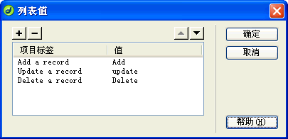 每个菜单选项对应一个作为表单参数提交给服务器的硬编码值。“列表值”对话框(显示在下面)将每个列表项都与一个值(“Add”、“Update”或“Delete”)匹配起来:
